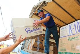 Лагерь временного содержания украинских беженцев. Сотрудники МЧС России во время разгрузки гуманитарной помощи беженцам.