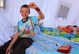 Лагерь временного содержания украинских беженцев. Мальчик с георгиевской ленточкой на руке в одной из палаток лагеря.