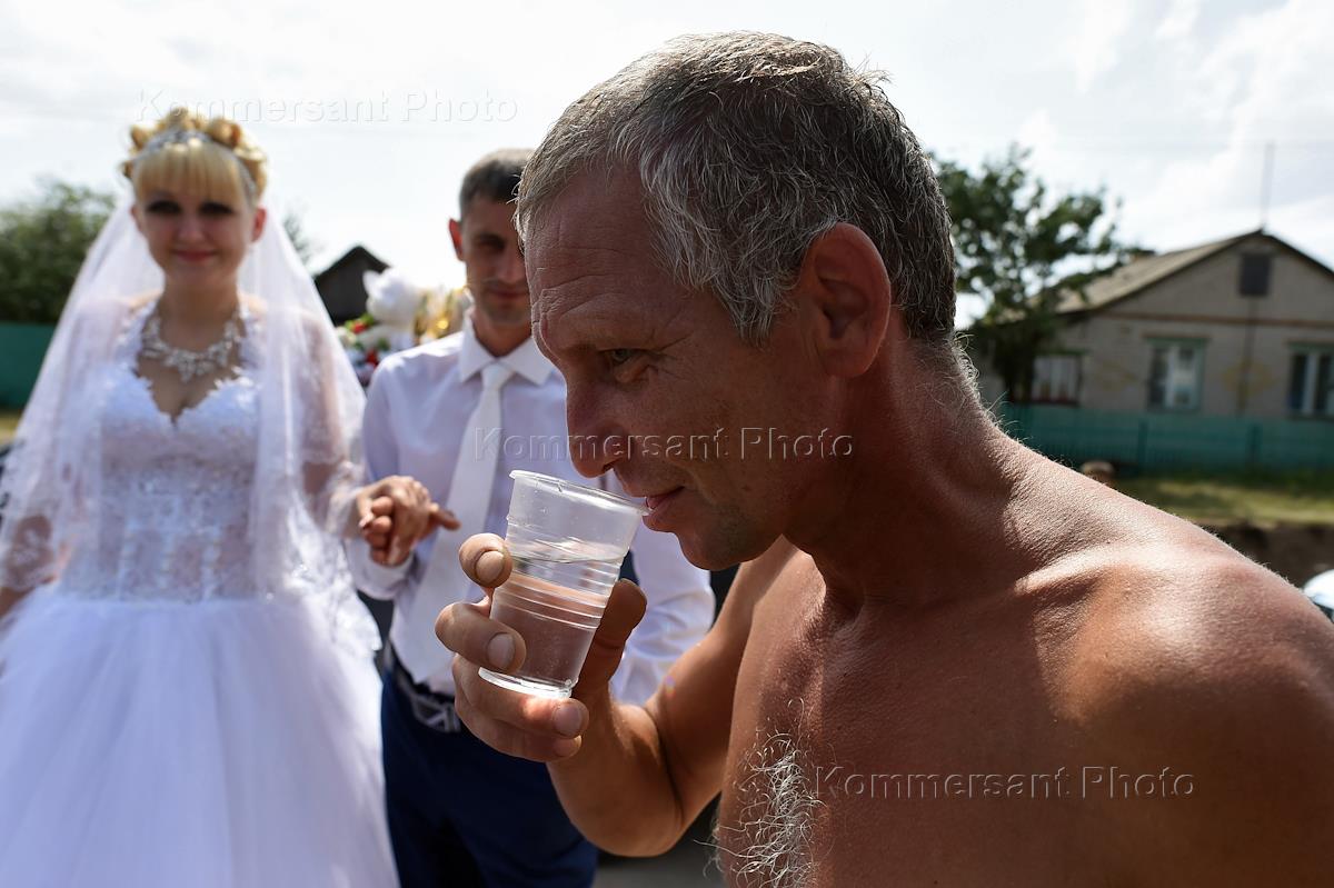 Жанровая фотография. Деревенская свадьба. Гость праздника пьет стакан водки за счастье жениха и невесты.