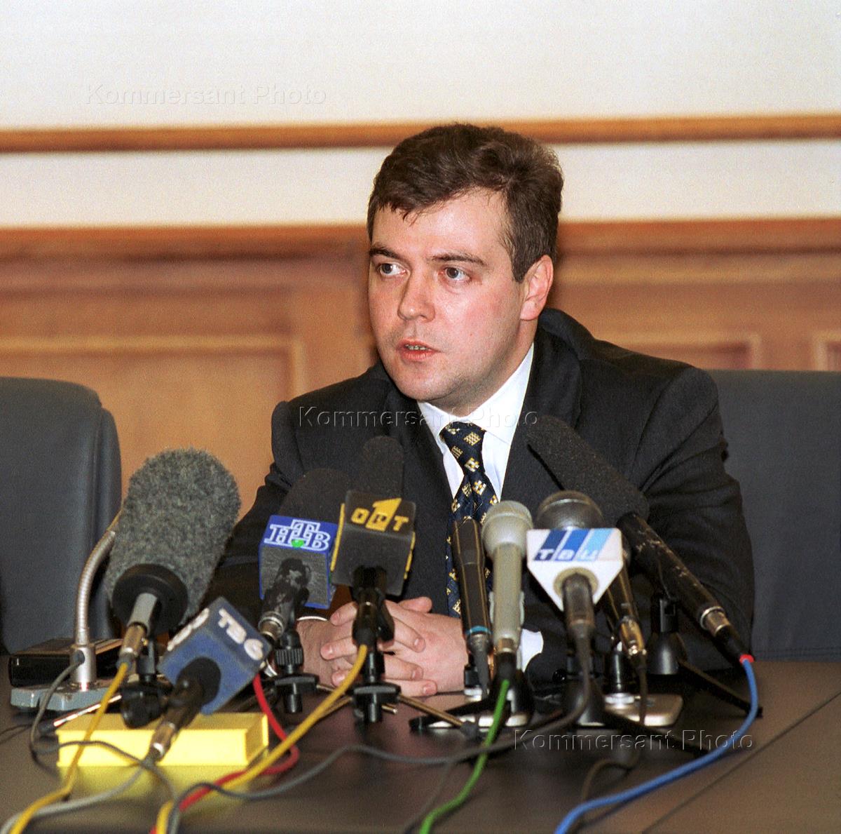 Deputy head of the Presidential Administration Dmitry Medvedev answers journalists' questions after promulgation of preliminary results of elections in a staff of the candidate on a post of the President of the country Vladimir Putin.