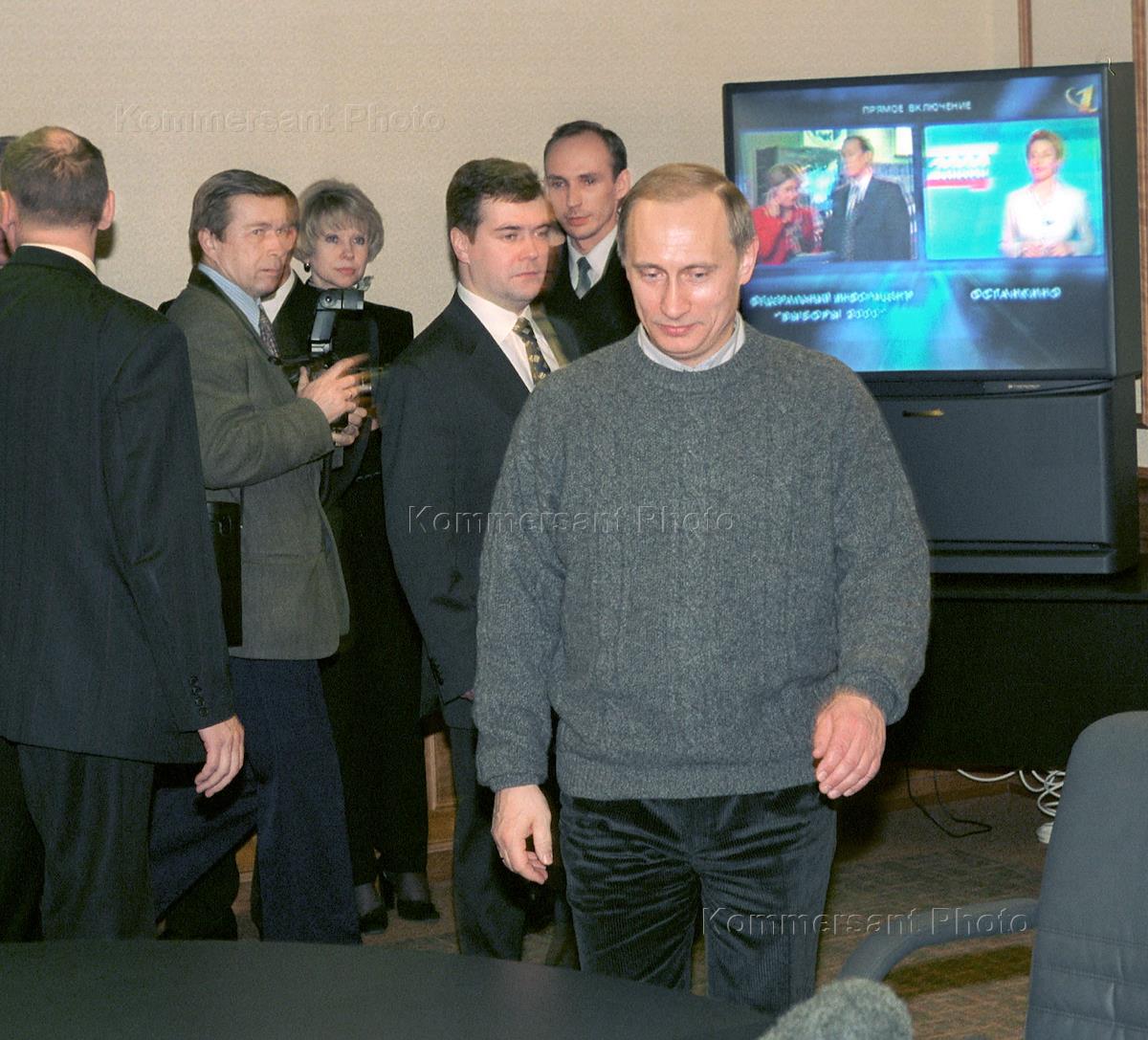 Press Minister Mikhail Lesin (left)and Kremlin chief of staff Alexander Voloshin (right) in Putin's Elections Headquarters.