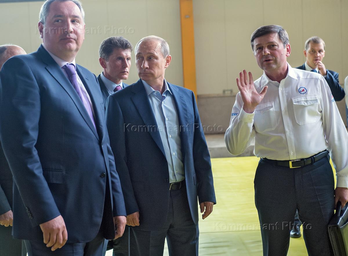 Руководитель Российского космического агентства (Роскосмос) Олег Остапенко(слева), заместитель председателя правительства России Дмитрий Рогозин (в центре) и президент России Владимир Путин (справа) во время осмотра космодрома "Восточный".