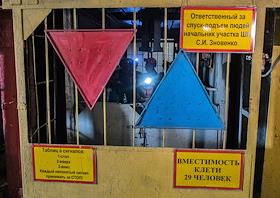 Российская государственная горнорудная компания"АЛРОСА". Шахтеры в клети подземного рудника по добыче алмазоносной руды "Мир".