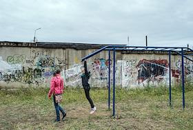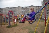 Виды города Мирный. Девочка качается на качелях на детской площадке.