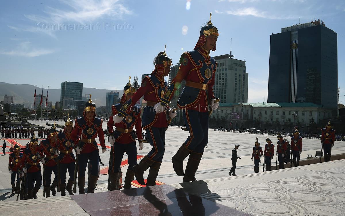 Рабочая поездка президента России Владимира Путина в Монголию. Президент России Владимир Путин (второй слева) и президент Монголии Цахиагийн Элбэгдорж (третий справа) во время церемонии официальной встречи на площади Чингисхана в Улан-Баторе.