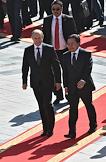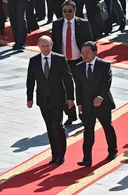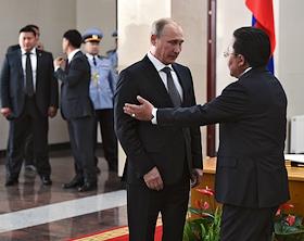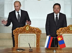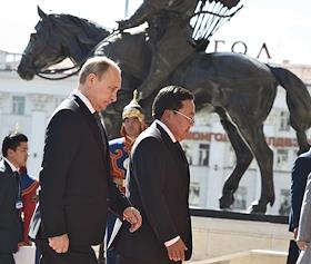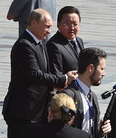 Рабочая поездка президента России Владимира Путина в Монголию. Президент России Владимир Путин (слева) и президент Монголии Цахиагийн Элбэгдорж (справа) во время церемонии официальной встречи на площади Чингисхана в Улан-Баторе.