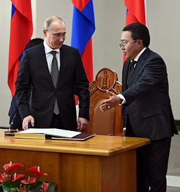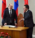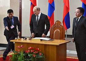 Рабочая поездка президента России Владимира Путина в Монголию. Президент России Владимир Путин (слева) во время записи в книге почетных гостей в Государственном дворце Президент Монголии Цахиагийн Элбэгдорж (справа).