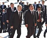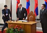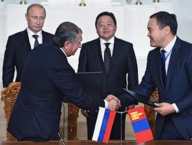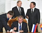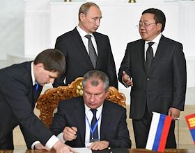 Рабочая поездка президента России Владимира Путина в Монголию. Слева направо: президент России Владимир Путин, председатель правления, заместитель председателя совета директоров ОАО "НК "Роснефть" Игорь Сечин, президент Монголии Цахиагийн Элбэгдорж во время церемонии подписания совместных документов по итогам Российско-монгольских переговоров в Государственном дворце.