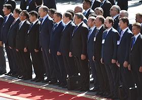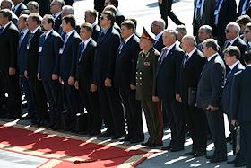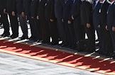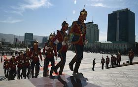 Рабочая поездка президента России Владимира Путина в Монголию. Президент России Владимир Путин (второй слева) и президент Монголии Цахиагийн Элбэгдорж (третий справа) во время церемонии официальной встречи на площади Чингисхана в Улан-Баторе.
