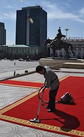 Рабочая поездка президента России Владимира Путина в Монголию. Женщина чистит ковер пылесосом на площади Чингисхана перед началом церемонии официальной встречи президента России Владимира Путина и президента Монголии Цахиагийна Элбэгдоржа.