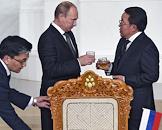 Рабочая поездка президента России Владимира Путина в Монголию. Президент России Владимир Путин (справа второй) и президент Монголии Цахиагийн Элбэгдорж (справа) во время двусторонней встречи в Государственном дворце.
