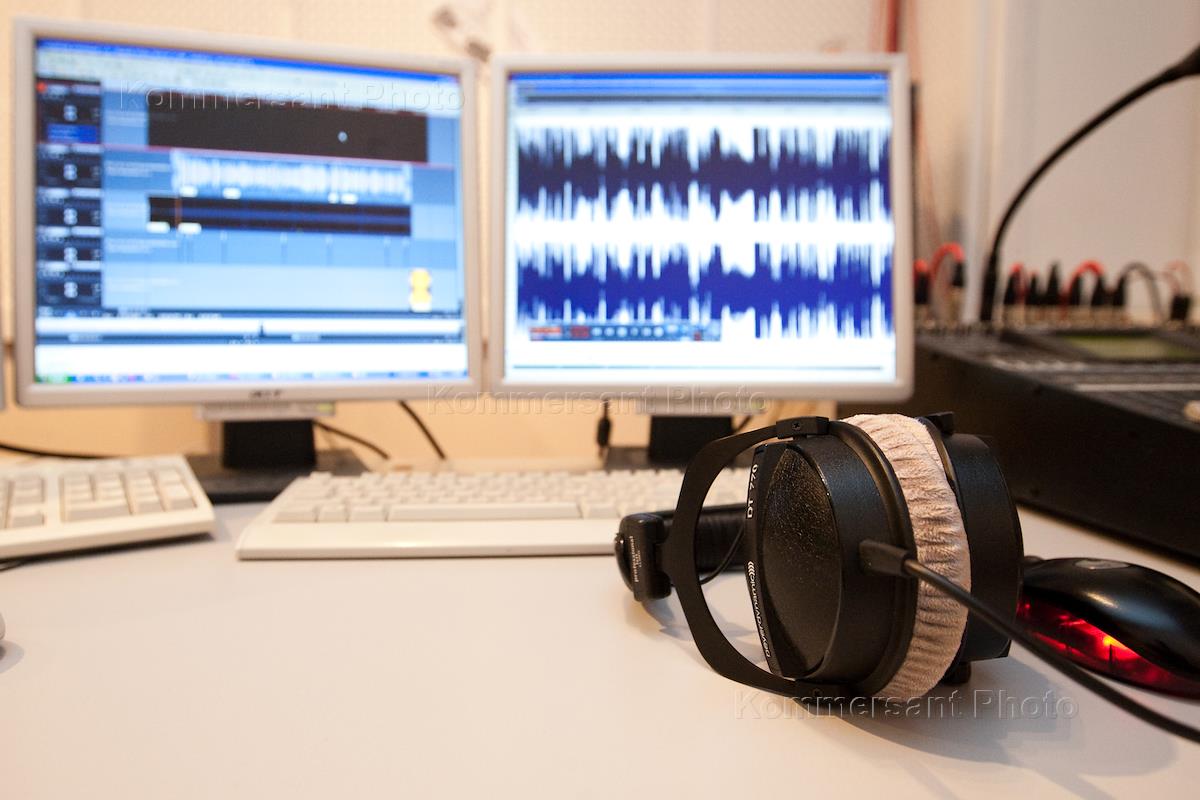 Студия радиостанции Rock FM (95,2 FM). Мониторы компьютера и наушники ведущего.