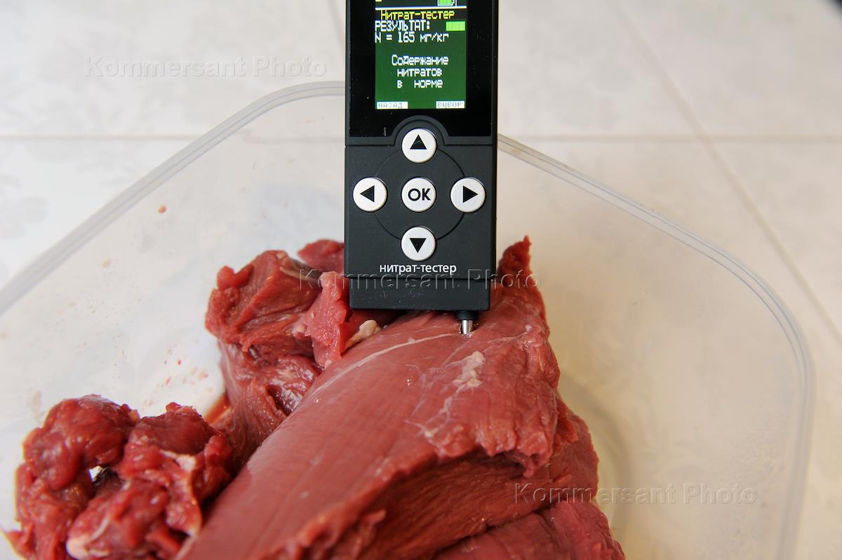 Жанровая фотография. Замер содержания нитратов в мясе тестером нитратов.