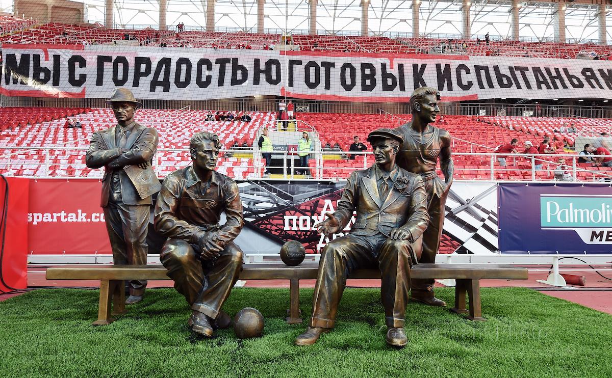 Стадион футбольного клуба "Спартак" "Открытие Арена" перед началом матча между командами "Спартак" (Россия, Москва) —"Царвена Звезда" (Сербия, Белград). Памятник братьям Николаю, Андрею, Александру и Петру Старостиным.