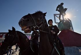 Сотрудники конной полиции перед началом матча между командами "Спартак" (Россия, Москва) —"Црвена Звезда" (Сербия, Белград). Матч прошел на стадионе футбольного клуба "Спартак" "Открытие Арена".