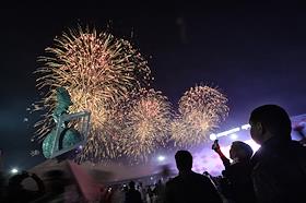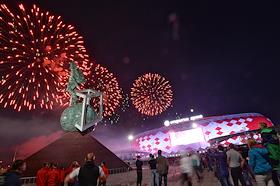 Фейерверк над стадионом "Открытие Арена" после окончания товарищеского матча по футболу между командами "Спартак" (Россия, Москва) и "Црвена Звезда" (Сербия, Белград).