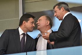 Губернатор Московской области Андрей Воробьев (слева) и лидер Коммунистической партии России Геннадий Зюганов (в центре) на трибуне во время товарищеского матча по футболу между ФК "Спартак" (Россия, Москва) и ФК "Црвена Звезда" (Сербия, Белград) на стадионе "Открытие Арена".