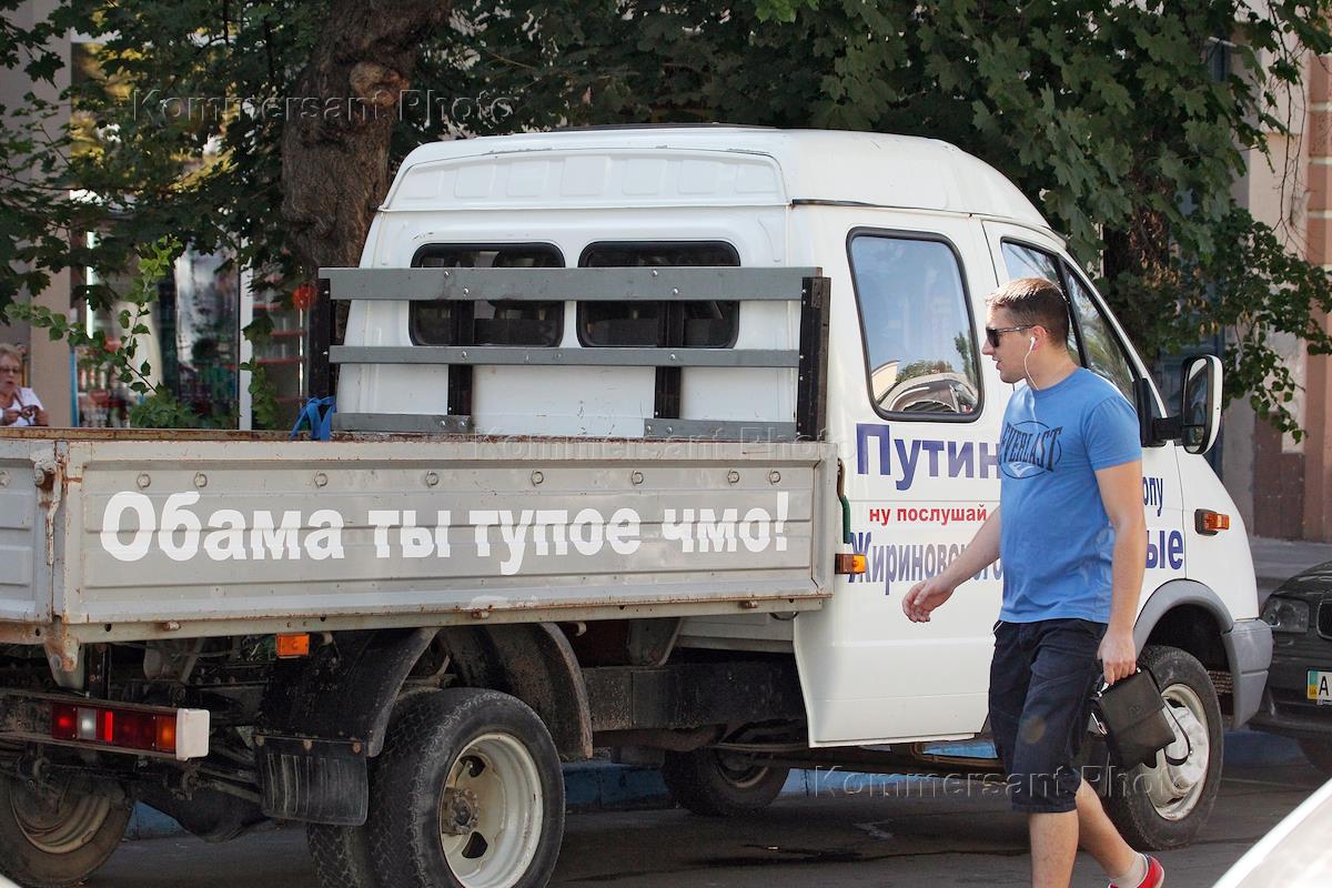 Жанровая фотография. Надпись на кузове автомобиля "Путин послушай Жириновского! И войдем в Европу по самые Нидерланды!".