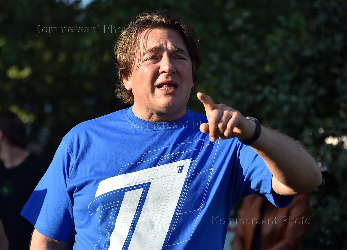 Международная акция Ice Bucket Challenge с участием представителей Первого канала, Видеоинтернешнл и TNS около памятнику Владимиру Зворыкину. Генеральный директор телекомпании "Первый канал" Константин Эрнст перед началом акции.