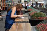 Жанроваф фотография. Девушка за столом на летней площадке закрытого ресторана сети McDonald’s.