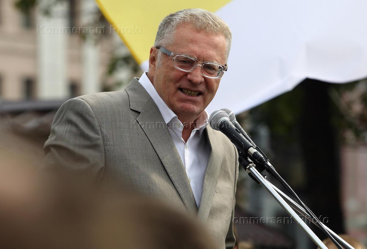 День государственного флага России. Лидер Либерально-демократической партии России (ЛДПР) Владимир Жириновский во время митинга в поддержку инициативы партии о замене нынешнего российского флага на имперский черно-желто-белый флаг. Митинг прошел в Новопушкинком сквере.