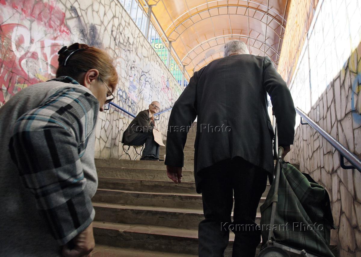 Виды города Тула. Нищий инвалид просит милостыню на лестнице подземного перехода.