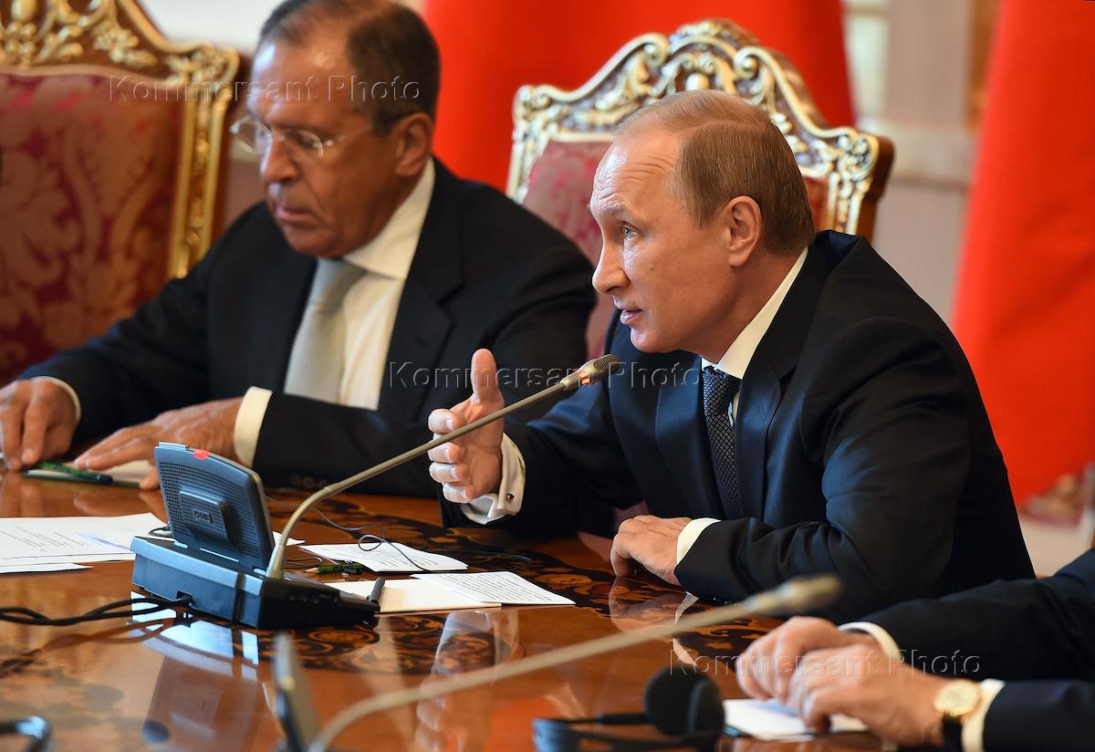 Рабочая поездка президента России Владимира Путина в Душанбе. Саммит Шанхайской организации сотрудничества (ШОС). Министр иностранных дел России Сергей Лавров (слева) и президент России Владимир Путин (справа) на переговорах, которые прошли в рамках Саммита ШОС.