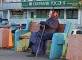 Жанровая фотография. Пожилая женщина на скамейке в сквере. Офис Сбербанка России.
