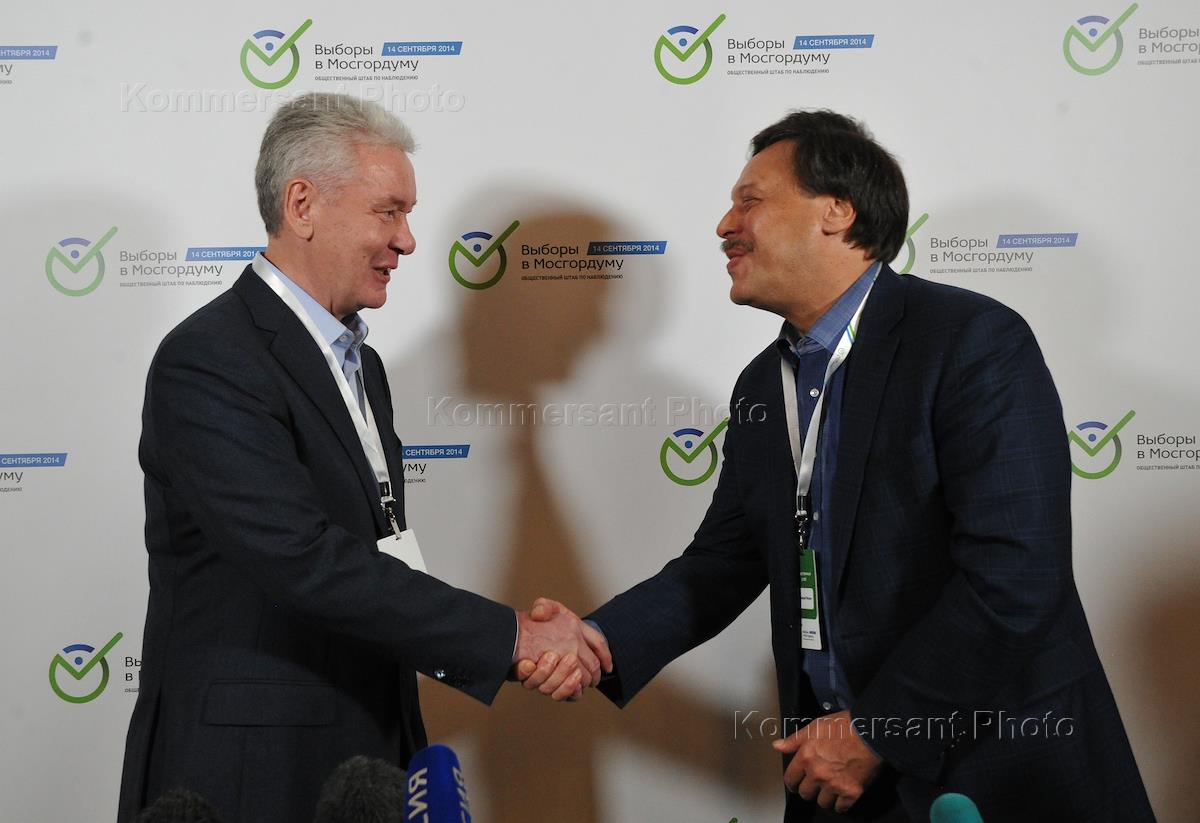 Единый день голосования. Выборы в Московскую городскую думу. Главный редактор радиостанции "Эхо Москвы" Алексей Венедиктов (слева) и мэр Москвы Сергей Собянин (справа) после знакомства с работой штаба Общественной палаты России во время выборов.