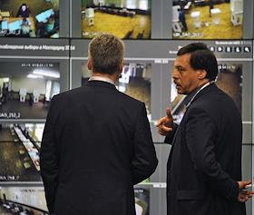 Единый день голосования. Выборы в Московскую городскую думу. Мэр Москвы Сергей Собянин (слева) и полномочный представитель правительства России в высших судебных инстанциях Михаил Барщевский (справа) во время знакомства с работой штаба Общественной палаты России во время проведения выборов.