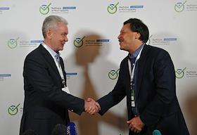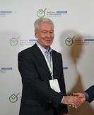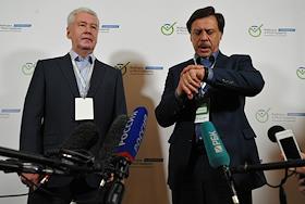 Единый день голосования. Выборы в Московскую городскую думу. Мэр Москвы Сергей Собянин (слева) и полномочный представитель правительства России в высших судебных инстанциях Михаил Барщевский (справа) после знакомства с работой штаба Общественной палаты России во время выборов.
