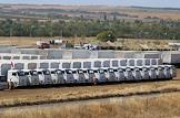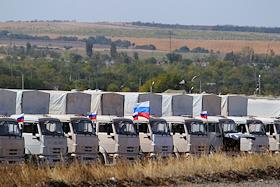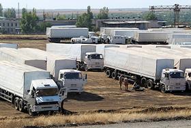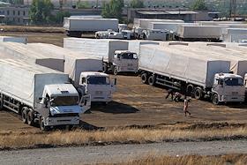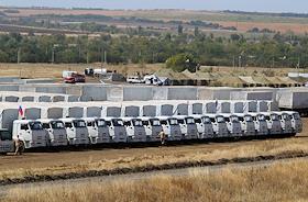 Машины гуманитарного конвоя в базовом лагере после возвращения из Луганска.