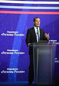 Председатель Всероссийской политической партии "Единая Россия", председатель Правительства России Дмитрий Медведев на Всероссийском медиафоруме "Регионы России".