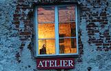 Жанровая фотография. Освещенное окно в стене старинного дома с вывеской "Ателье".