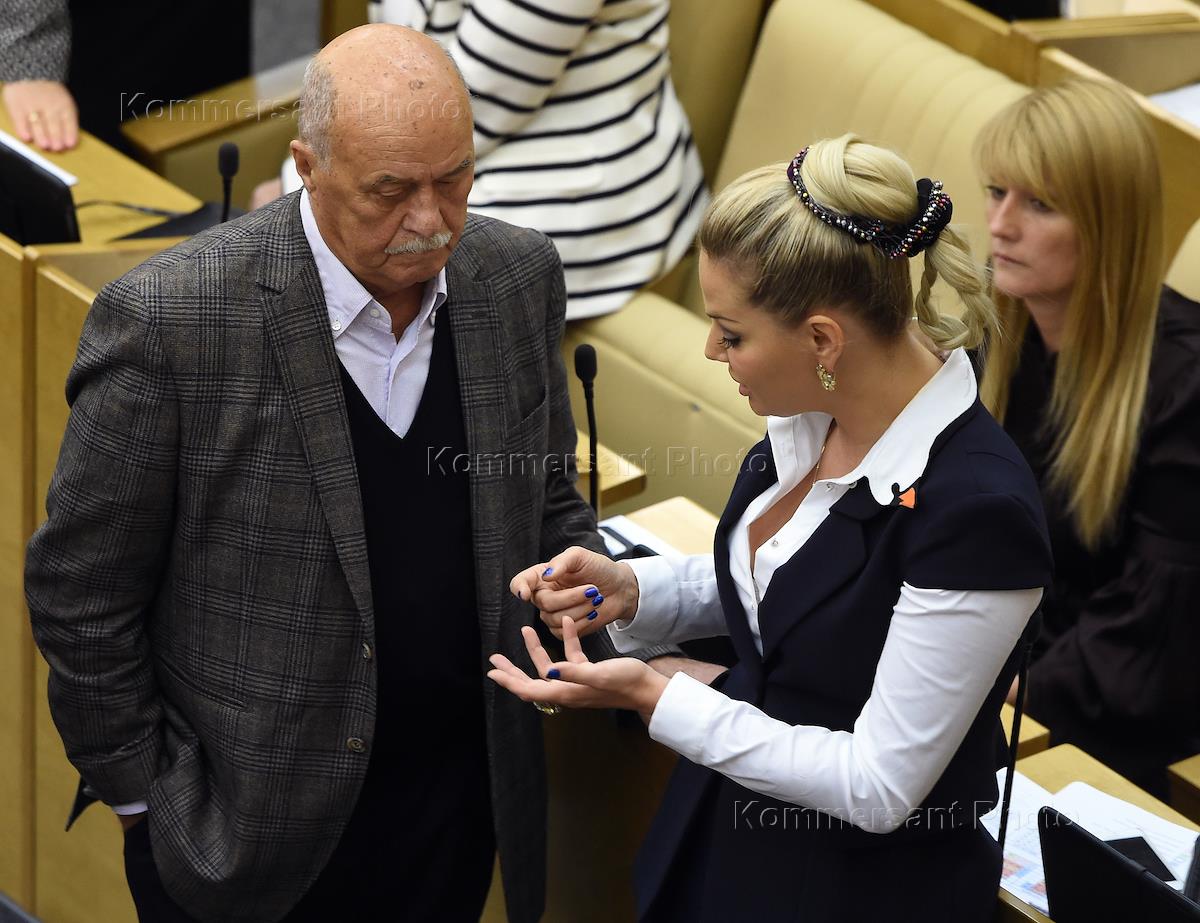 Член комитета Государственной думы (ГД) России по культуре Мария Максакова (слева) и председатель комитета ГД России по конституционному законодательству и государственному строительству Владимир Плигин (справа) на пленарном заседании Госдумы.