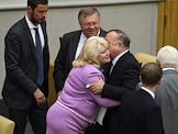 Слева направо: член комитета Государственной думы (ГД) России по культуре Мария Максакова, заместитель председателя комитета ГД России по обороне Франц Клинцевич и первый заместитель председателя комитета ГД России по культуре Иосиф Кобзон на пленарном заседании Госдумы.