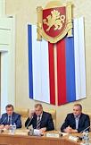 Слева направо: полномочный представитель президента России в Крымском федеральном округе Олег Белавенцев, председатель Совета министров Республики Крым Сергей Аксенов и председатель Государственного совета Республики Крым Владимир Константинов во время торжественной церемонии вручения удостоверений избранным депутатам Государственного совета Республики Крым первого созыва.