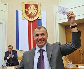 Слева направо: полномочный представитель президента России в Крымском федеральном округе Олег Белавенцев, председеталь избирательной комиссии Республики Крым Михаил Малышев и председатель Совета министров Республики Крым Сергей Аксенов во время торжественной церемонии вручения удостоверений избранным депутатам Государственного совета Республики Крым первого созыва.