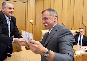 Председатель Совета министров Республики Крым Сергей Аксенов (слева) и председатель Государственного совета Республики Крым Владимир Константинов (в центре) во время торжественной церемонии вручения удостоверений избранным депутатам Государственного совета Республики Крым первого созыва.
