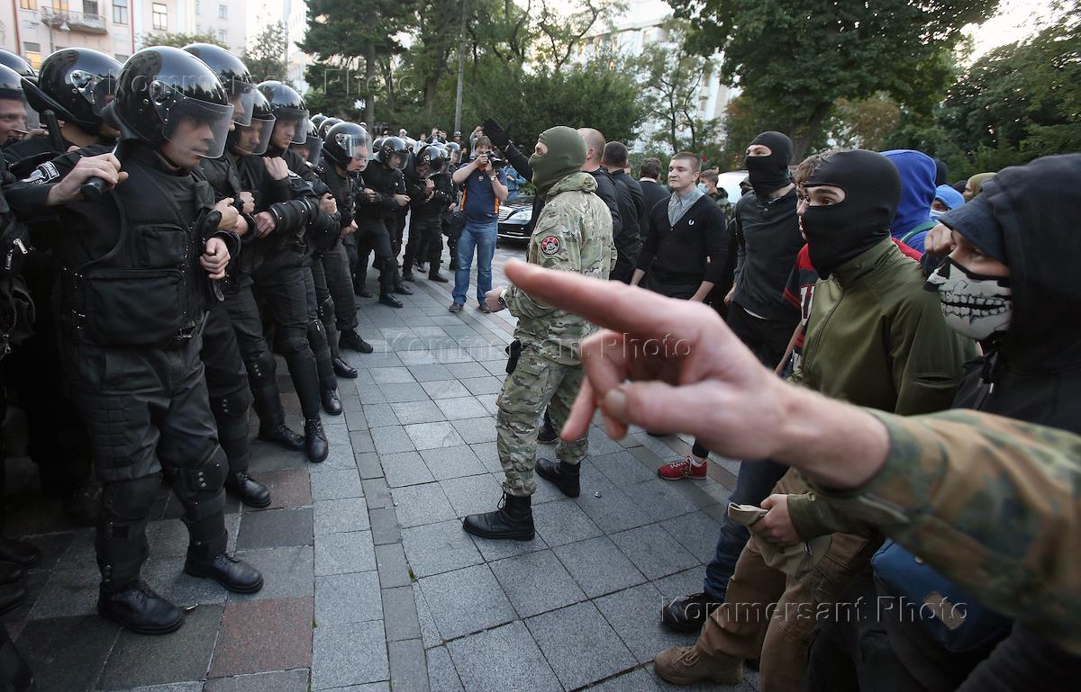 Активисты "Правого сектора" во время митинга в поддержку принятия законопроекта о люстрации органов госвласти. Митинг прошел около здания Верховной Рады Украины.