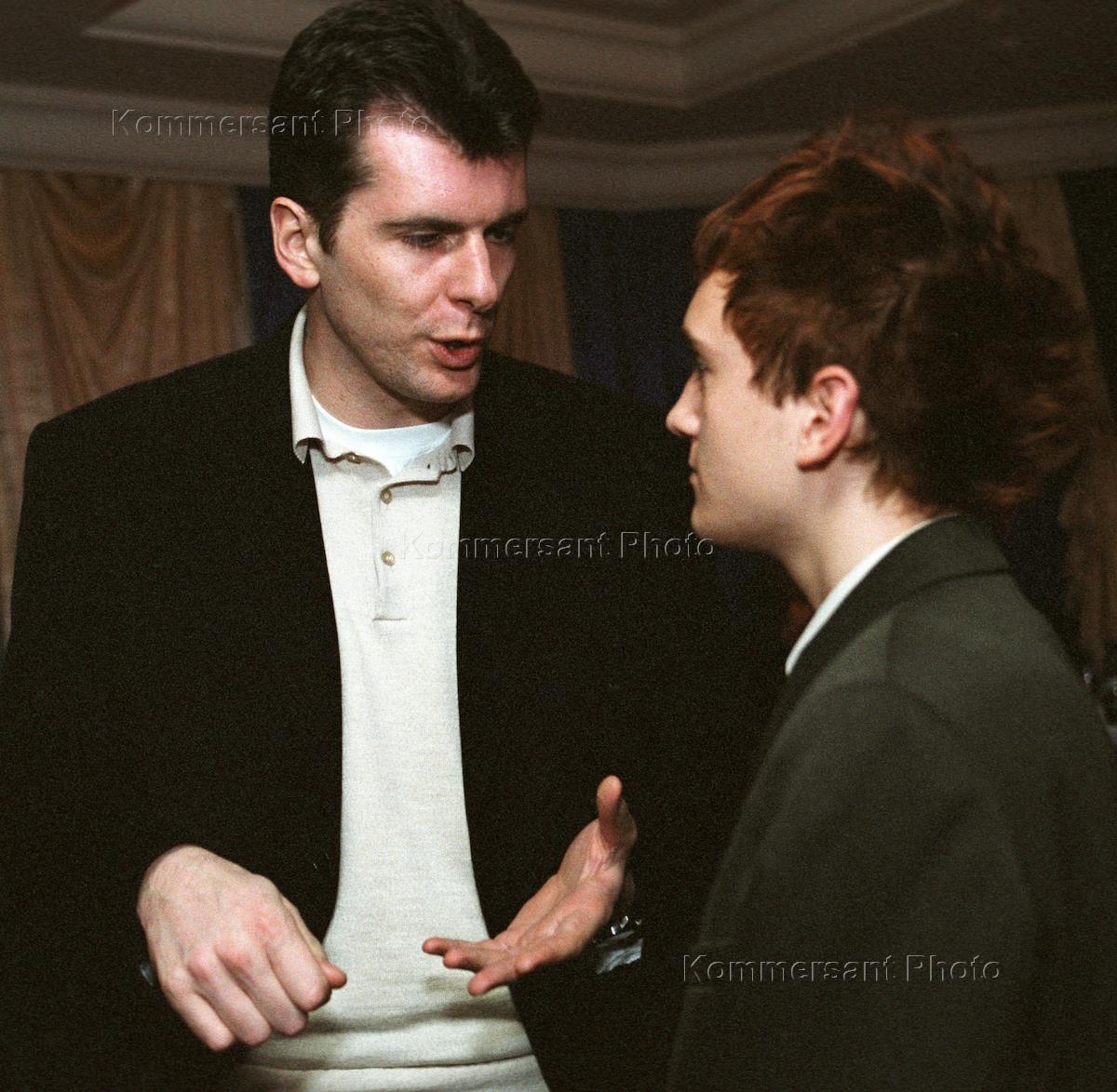 Director general of the Luzhniki Sports Complex Vladimir Aleshin (left) listens to the chairman of the Norilsk Nikel company governance board Mikhail Prokhorov (right) during the party held in honour of the Russian basketball coach Alexander Gomelsky. The party took place in the Moscow Business Centre.