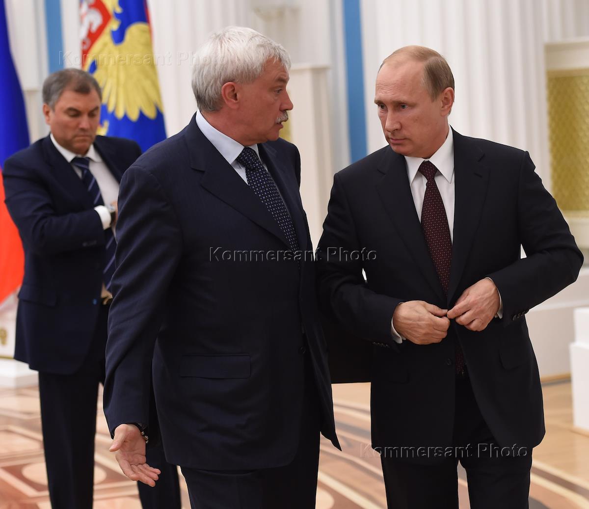 Встреча президента России Владимира Путина с вновь избранными руководителями субъектов Российской Федерации. Губернатор Санкт-Петербурга Георгий Полтавченко (слева) и президент России Владимир Путин (справа) во время встречи.