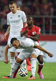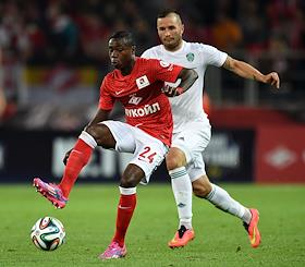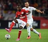 СОГАЗ-Чемпионат России по футболу 2014/15. 8-й тур. Матч между командами "Спартак" (Москва) и "Терек" (Грозный) прошел на стадионе "Открытие Арена". Футболисты Квинси Промес (слева) и Федор Кудряшов (справа) во время матча.