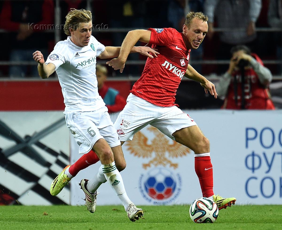 СОГАЗ-Чемпионат России по футболу 2014/15. 8-й тур. Матч между командами "Спартак" (Москва) и "Терек" (Грозный) прошел на стадионе "Открытие Арена". Футболисты Ким Чельстрём (слева) и Андрей Семенов (справа) во время матча.