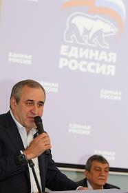 Секретарь генерального совета партии "Единой Россия" Сергей Неверов (слева) и глава Агентства по развитию Севастополя Алексей Чалый (справа) во время конференции севастопольской городской партийной организации "Единой России".
