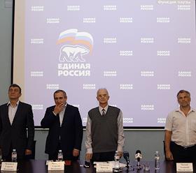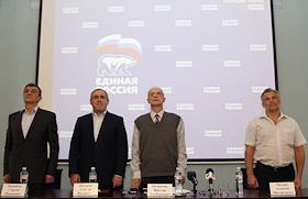 Слева направо: губернатор Севастополя Сергей Меняйло, секретарь генерального совета партии "Единой Россия" Сергей Неверов, секретарь севастопольского регионального отделения партии "Единая Россия" Виктор Оганесян и глава Агентства по развитию Севастополя Алексей Чалый во время конференции севастопольской городской партийной организации "Единой России".