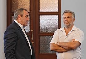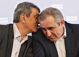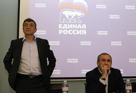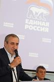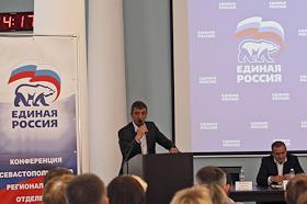 Губернатора Севастополя Сергей Меняйло (слева) и секретарь генерального совета партии "Единой Россия" Сергей Неверов (спрва) во время конференции севастопольской городской партийной организации "Единой России".