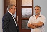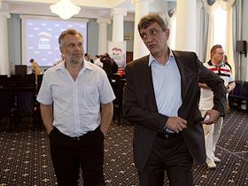 Губернатора Севастополя Сергей Меняйло (справа) и глава Агентства по развитию Севастополя Алексей Чалый (слева) во время конференции севастопольской городской партийной организации "Единой России".