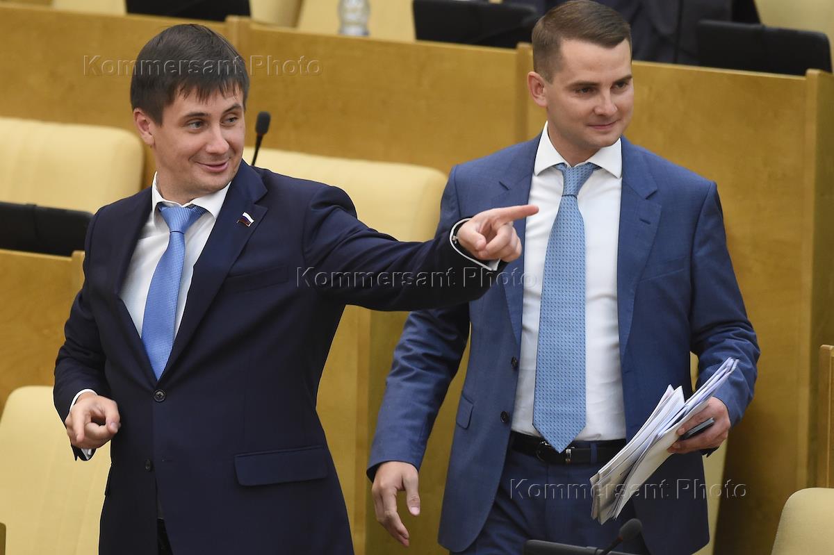 Первый заместитель председателя комитета Государственной думы (ГД) России по информационной политике, информационным технологиям и связи Вадим Деньгин (слева) и председатель комитета ГД по делам общественных объединений и религиозных организаций Ярослав Нилов (справа) во время заседания Госдумы.