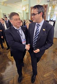 Депутат Московской городской думы Степан Орлов (слева) и председатель Совета муниципальных образований города Москвы Алексей Шапошников (справа) на конференции Московского городского регионального отделения партии "Единая Россия" в Центральном Доме ученых РАН.